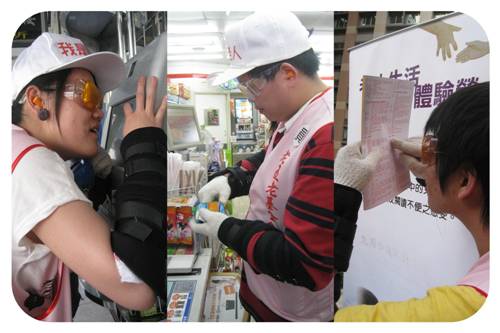 活動方式:穿戴仿老人退化教具,體驗長輩購物、寫字、坐車等生活上的不便。
