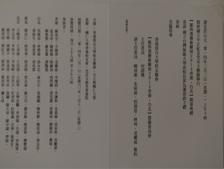 (二)<天主教輔仁大學>協辦單位: 輔仁大學香港校友會 北京文德堂書畫院 開幕禮 香港展場 定於2014年2月21日下午五時舉行; 台北展場 定於2014年3月3日(一)上午十時舉行‚出席開幕禮者‚(中正紀念堂3樓采玉藝廊,檔期於2014年2月28至3月13日舉辦聯展)