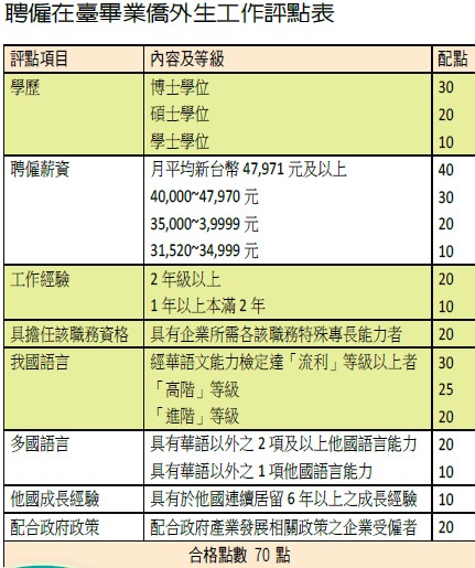 新聞辭典:「評點配額」是行政院在103年7月1日起實施的「強化優秀僑外生留臺工作行動計畫」中,所設置的僑外生留台工作評點機制,項目包括學歷、工作經驗、聘雇薪資、專業技能、華語及外語能力、外國生活經驗及配合政府產業發展相關政策等,若累計點數超過70點標準者,就可獲核發聘僱許可。