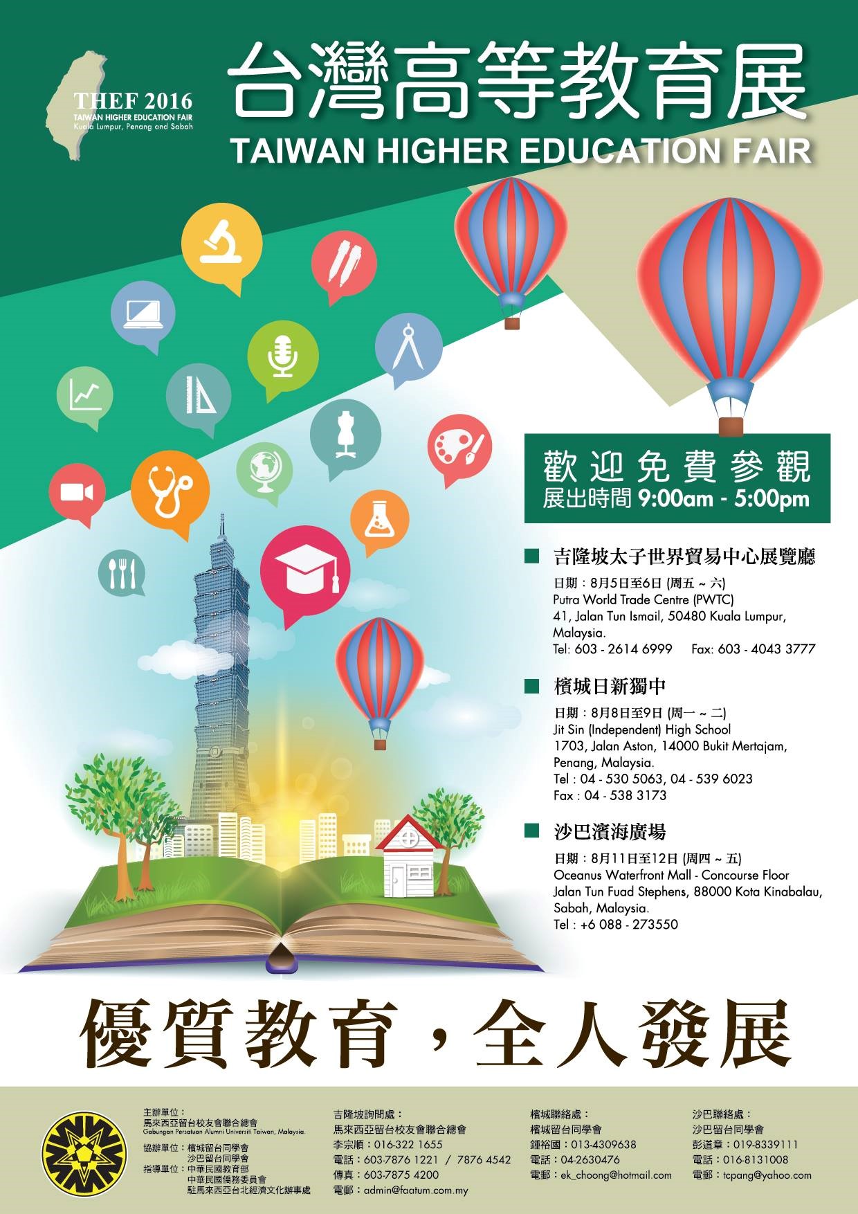 本會將於今年 8 月5 日至 12 日於吉隆坡、檳城及沙巴舉辦一年一度 三場盛大的 2016 年臺灣高等教育展,預計將有近 100 所臺灣各大專院校 參與展出,屆時將有參展院校近 200 名校長、院長及師長參與其盛。 謹訂於 2016 年 8 月 5 日(星期五),上午 11 時,假吉隆坡太子世貿 中心(PWTC)第四展廳舉行的「2016 台灣高等教育展」開幕禮暨 2016 年 8 月 6 日(星期六)晚上 7 時 30 分,假吉隆坡太子世貿中心宴會廳 ( PWTC MERDEKA HALL ) 舉行本會主題爲“寶島緣引留臺路 大馬延續 留臺情”之創會四十二週年慶文華之夜晚宴。 謹此專函誠邀撥冗出席上述兩場盛會,以資勉勵,如蒙俯允親臨指 導,必將使全場生色不少。