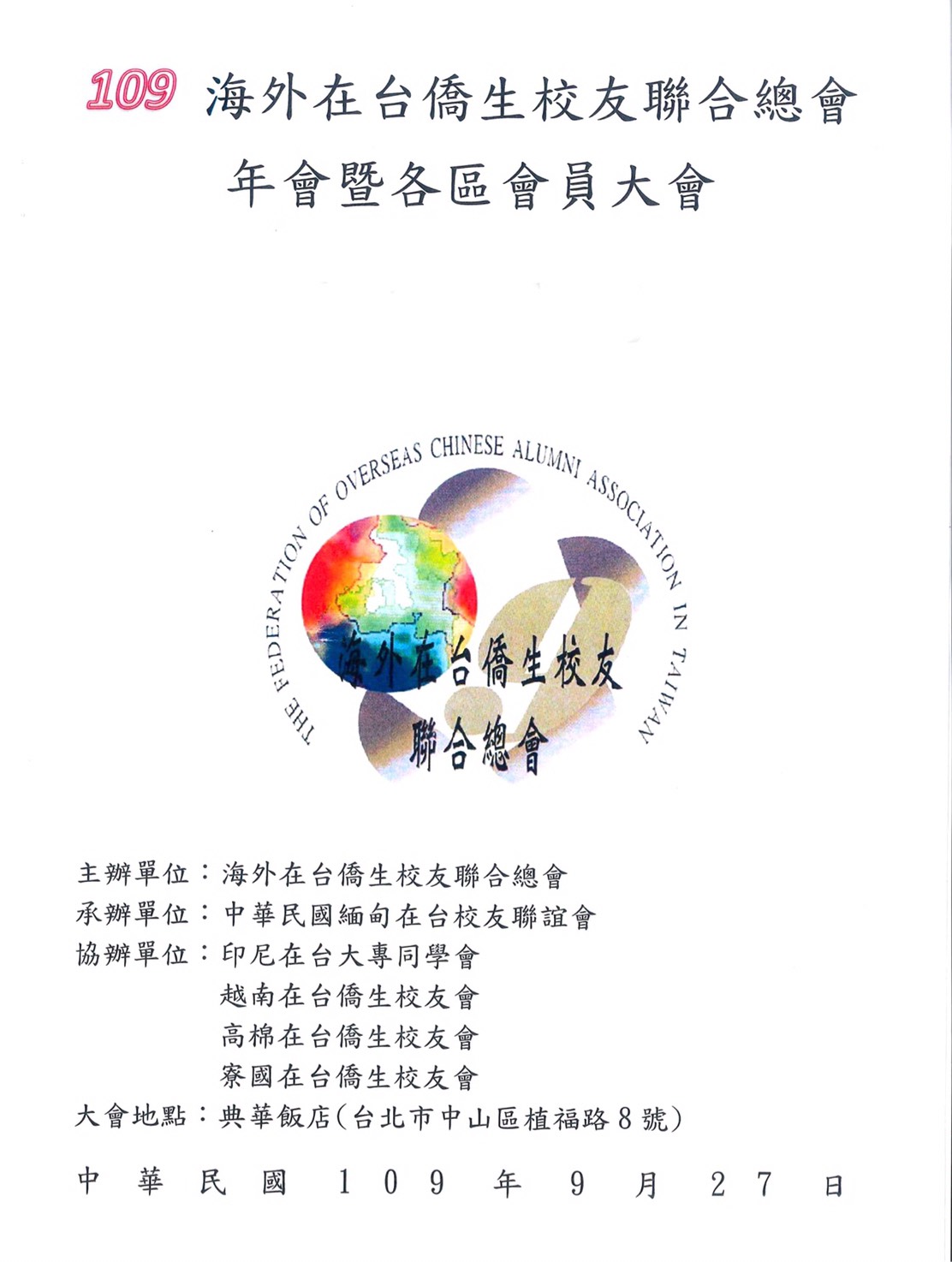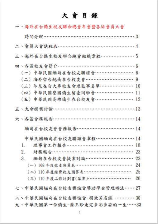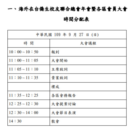 今年海外在台僑生校友聯合總會有關的印尼、越南、寮國、高棉、緬甸等各校友聯誼會聯合主辦會員大會,在輪值會長李沛主持下,於 109 年 9 月 27 日在台北典華飯店(台北市中山區植福路8號)召開海外在台僑生校友聯合總會會員大會,研議相關發展事項。有關本次大會討論提案、大會手冊封面、目錄、時間分配表及議程如次說明: