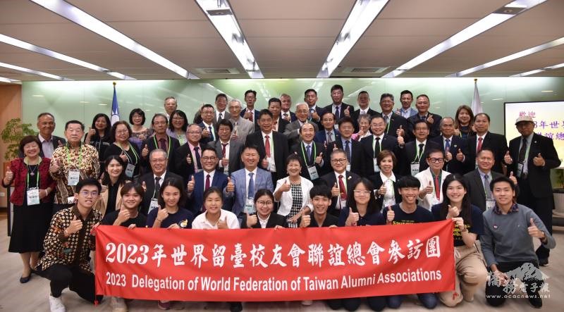 院長陳建仁、僑委會委員長徐佳青與世界留臺校友會聯誼總會線任總會長楊儒龍帶領「2023年世界留臺校友會聯誼總會參訪團」合影
