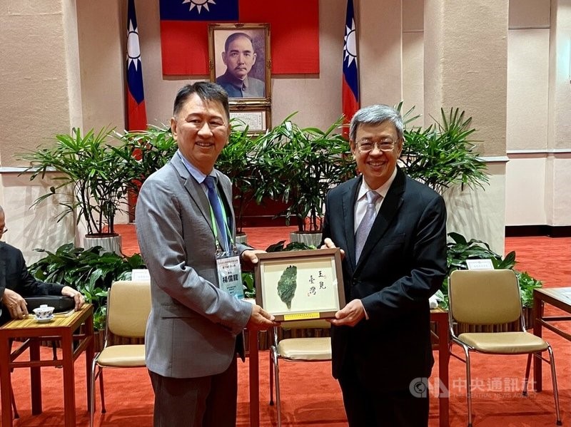 行政院院長陳建仁與世界留臺校友會聯誼總會線任總會長楊儒龍合影