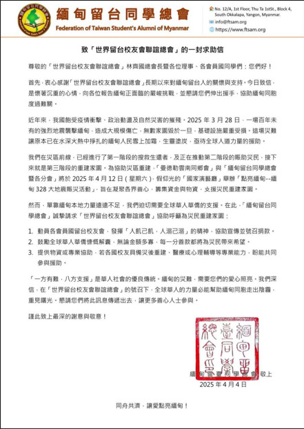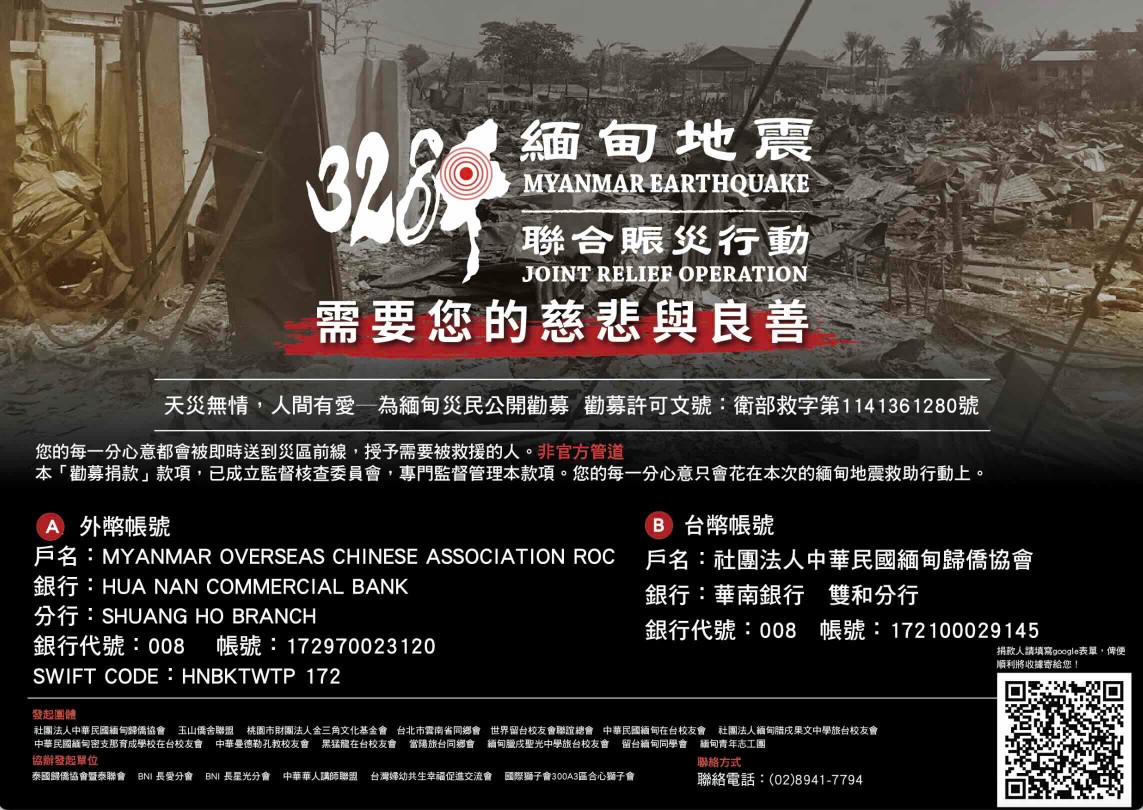328日,緬甸發生芮式規模8.2強震,造成重大傷亡與無數家庭破碎,災民流離失所,急需各界援助。身為緬僑的我們,深感痛心,也感同身受。在這場災難面前,我們無法袖手旁觀。一方有難,八方馳援。