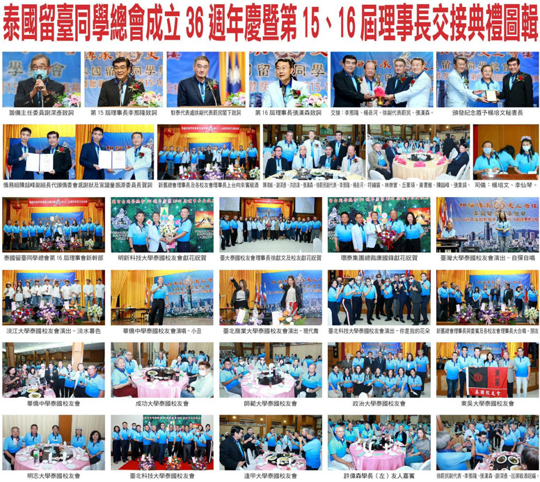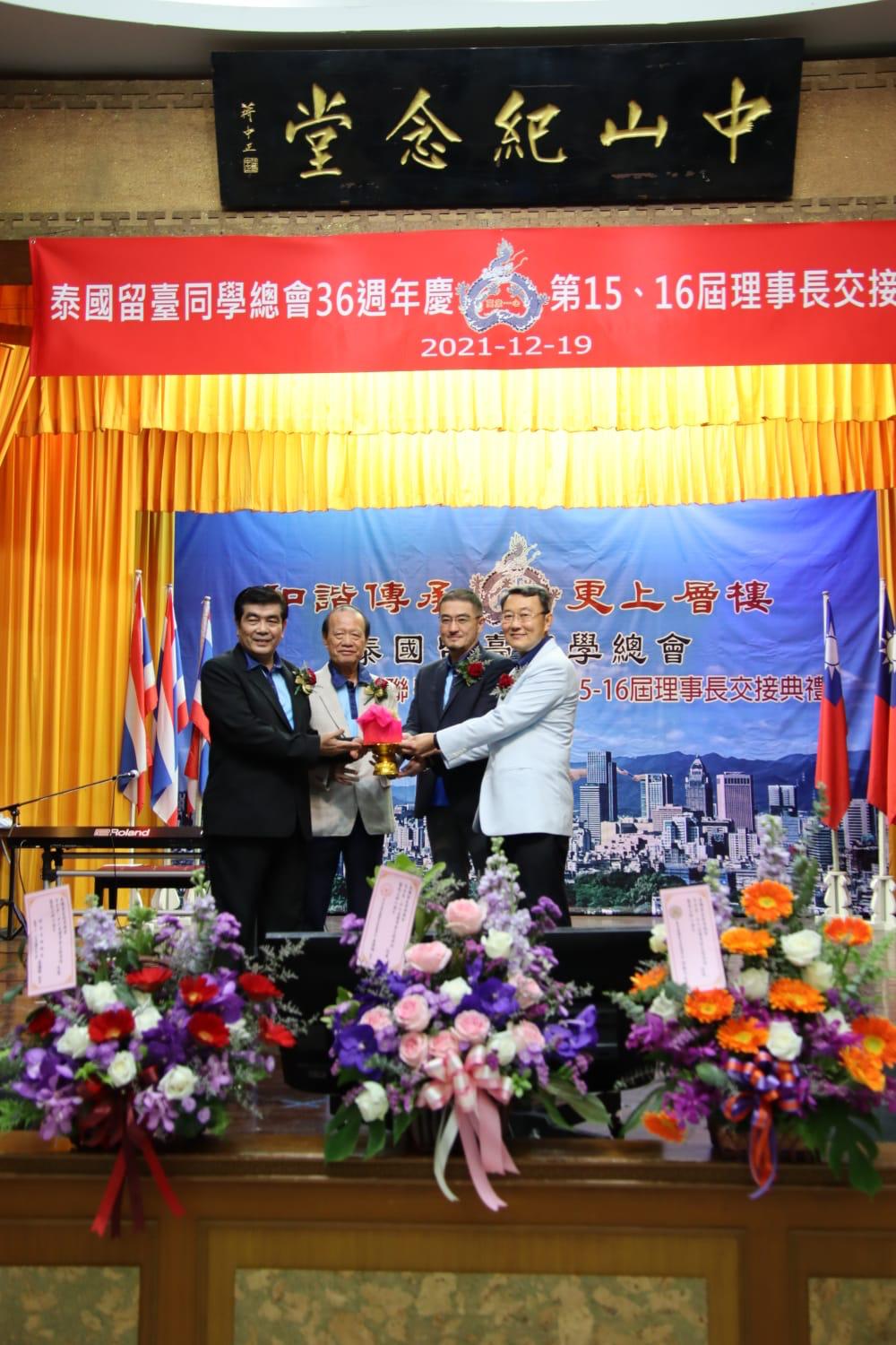 【泰國留台同學總會訊】泰國留台同總會於2021年12月19日下午五時半假泰國中華會館二樓中山紀念堂舉辦『成立36周年慶暨第15/16屆理事長交接典禮聯歡晚會』,氣氛溫馨、熱鬧歡騰;吉時一到中華民國駐泰國臺北經濟文化事處副代表徐蔚民、僑務組副組長陳超峰及秘書黃書雅、教育組組長歐陽彥恆、榮獲2019年泰國國家翻譯優良獎之前諮議張象綺等貴賓,以及兩百餘位留臺校友,大家穿著本次總會致贈36年來首次設計製作之留台同學總會會服,齊聚在舞臺前及舞臺上整齊地排隊、歡欣地站著拍攝一張「留臺人全家福大合照」。