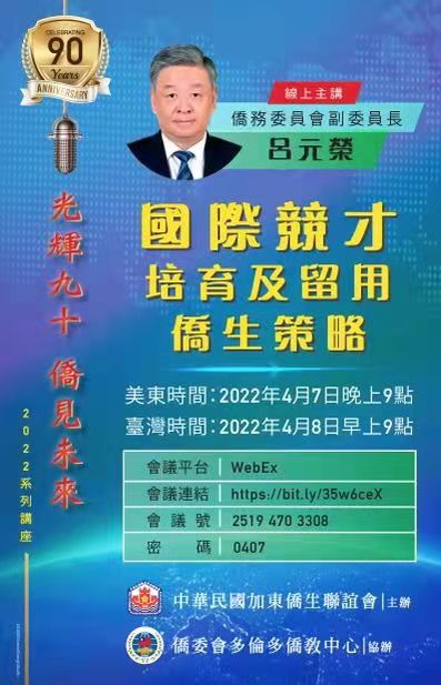 今年正值僑務委員會九十週年誌慶,由中華民國加東僑生聯誼會主辦,加拿大多倫多僑教中心協助,特於加東時間:2022年4月7日晚間9:00 (臺灣時間:2022年4月8日上午9:00)舉辦線上講座『光輝九十,僑見未來』系列講座-國際競才之培育及留用僑生策略」,並邀請僑委會呂副委員長元榮主講。