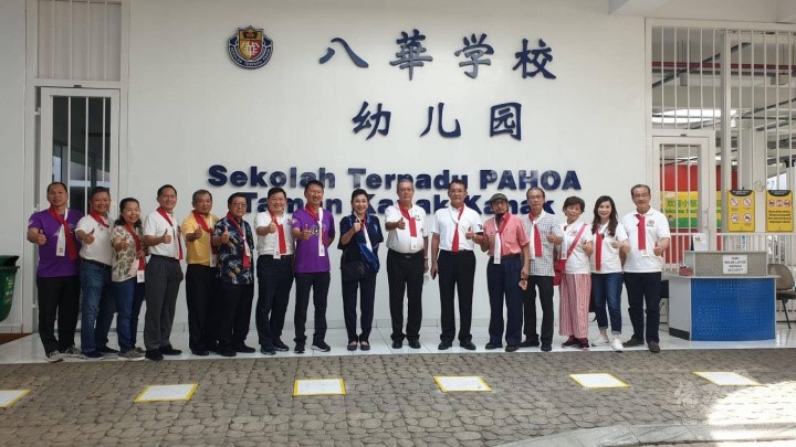 李子松拿督(右6)郭應茂總會長(右7)、李麗英校董(右8)、楊儒龍總會長(右9)、林正君會長(右10)等參觀八華學校合影