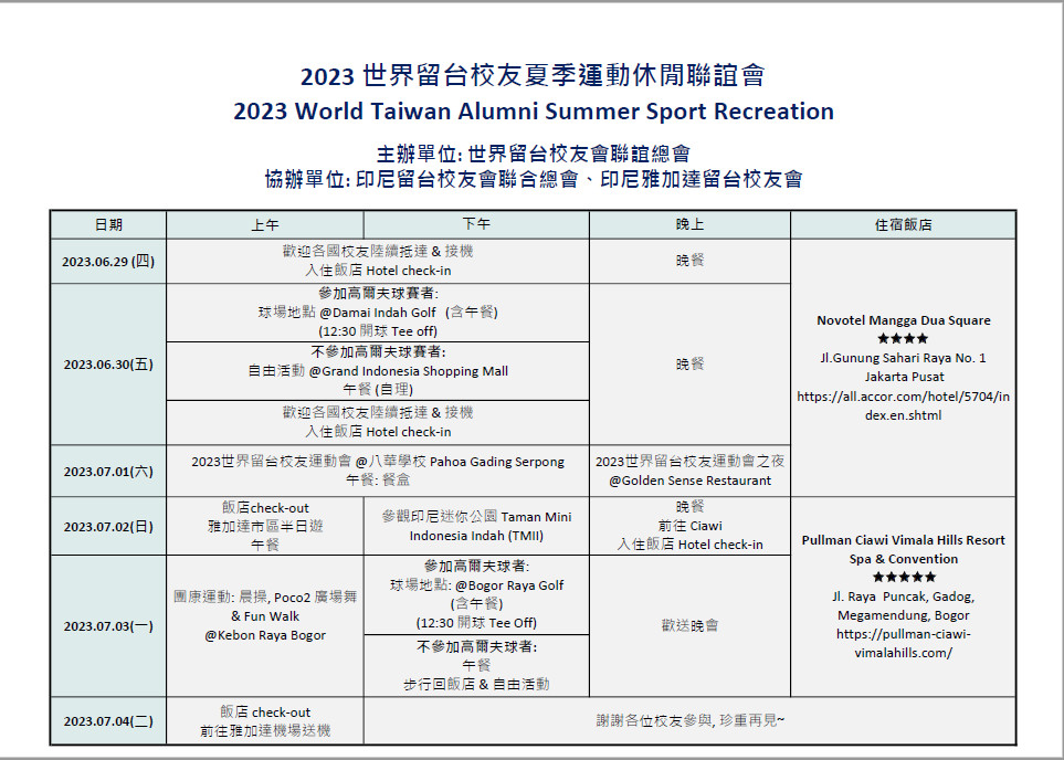 並已在本會於2023年3月18日上午10–12時第十二屆理監事暨秘書處第二次會議(Zoom 線上會議)通過有關本次在印尼雅加達6月30日- 7月03日舉行之『世界留台校友~夏季運動休閒聯誼會』活動議程。